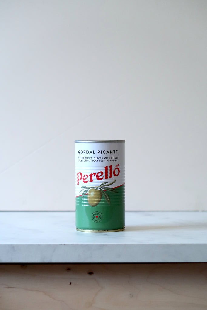 These Gordal olives are green, crisp and fleshy with a touch of heat from the guindilla chillies in the marinade.