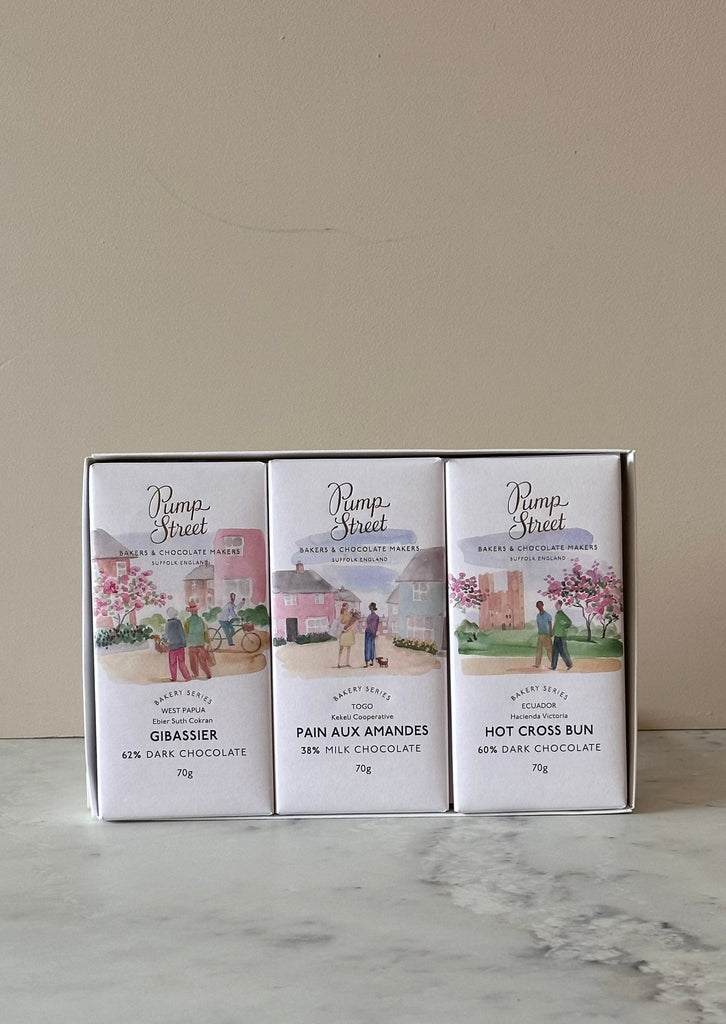 A presentation box of Pump Street Bakery new Spring collection chocolate bars made specifically to celebrate the arrival of the season. The box includes: Hot Cross Bun 60%, Gibassier 62%, Pain Aux Amandes 38%. All of the chocolate is made by Pump Street in their bakery in Suffolk, from bean to bar, and embellished with their own baked goods. Sounds delicious to us.